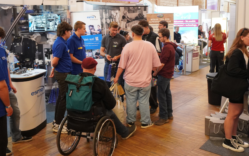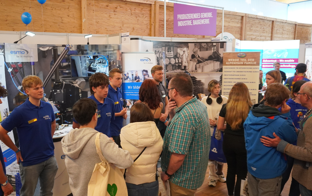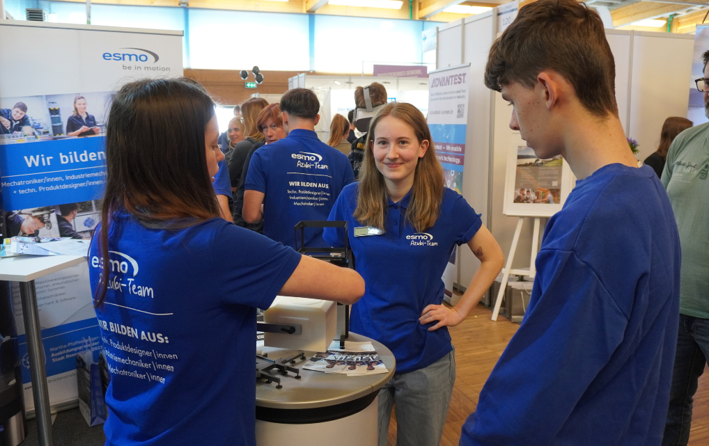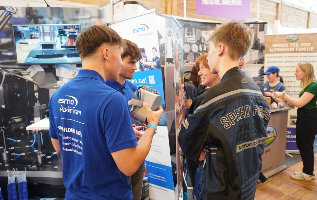 An unserem Stand erwartete die Besucherinnen und Besucher dabei nicht nur umfangreiche Informationen zu unseren Ausbildungsberufen und Praktikums-Möglichkeiten, sondern auch ein ganz besonderer Einblick in die Welt der esmo: Mithilfe von VR-Brillen konnten interessierte Jugendliche virtuell einen kleinen Rundgang durch unsere Ausbildungswerkstatt unternehmen und hautnah erleben, wie spannend Technik und Teamwork bei der esmo sind.